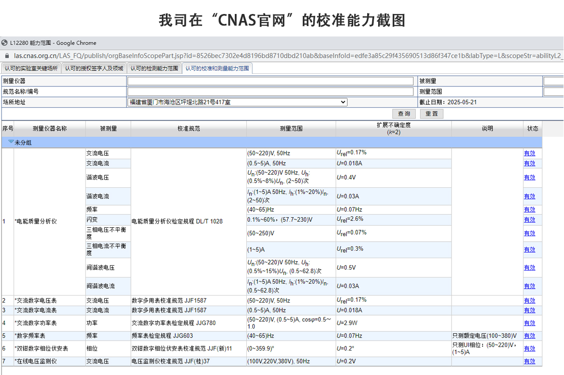 我公司具有电能质量分析仪(在线式和便携式)、电压表、电流表、相位表、频率表等相关监测、计量和保护类表计类校准CNAS资质,可根据具体情况为客户提供实验室或现场灵活方式校准业务。